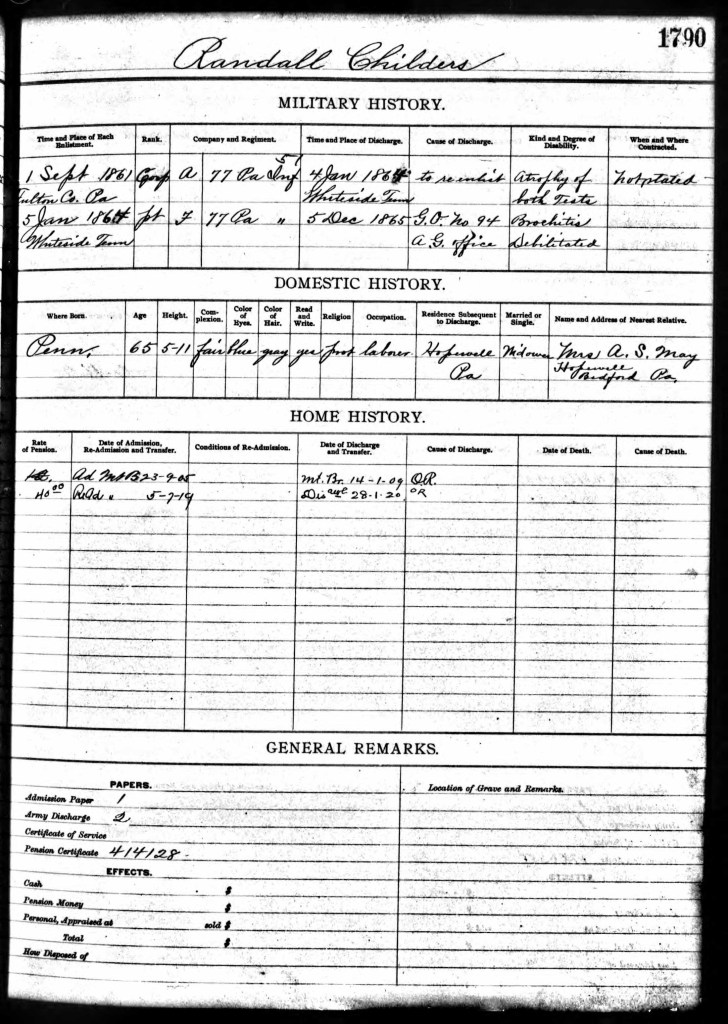 I remember a year or so ago when I was researching my second-great-grandfather, Randall Childers, that one of his daughters knew where he was at when he up and left Pennsylvania and moved to Tennessee. Well, maybe I am overstating, I’m not sure if Jennie Childers May knew where her father had relocated, but seeing her name as the “next of kin” on his paperwork was a surprise to me.