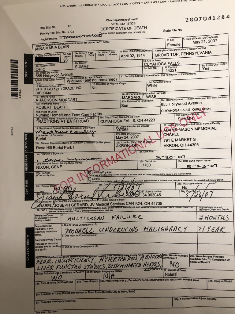 Death Certificate of Anna Maria (Morgart) Blair obtained at the Summit County Health Department