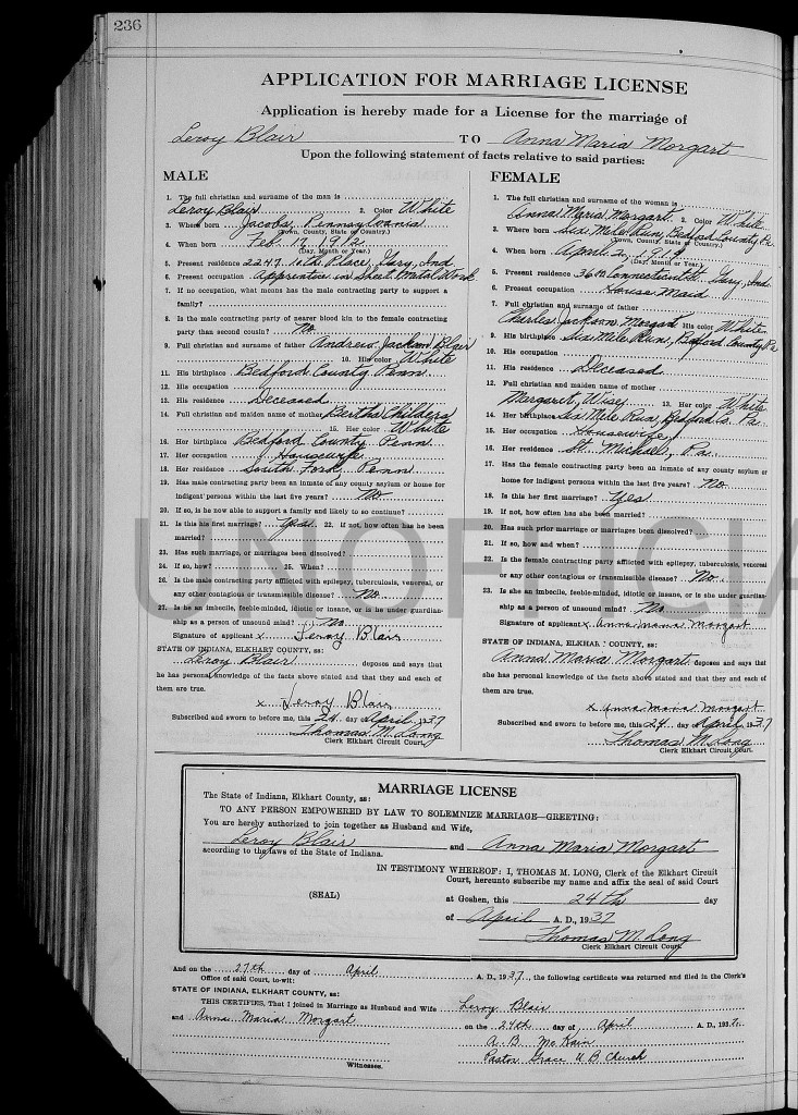 The above marriage certificate was found on FamilySearch as part of Indiana Marriages, 1811-2007