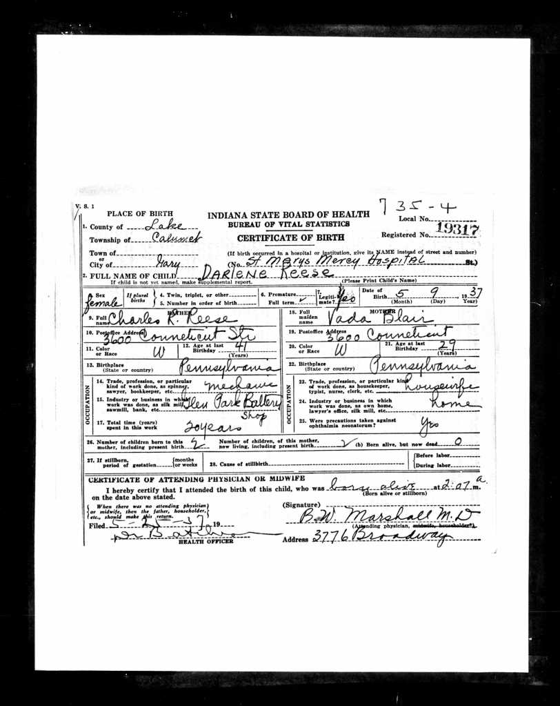 Darlene Reese was born 9 May 1937 at St. Mary’s Mercy Hospital in Gary, Lake, Indiana to Charles Randall Reese and Vada Blair (Vada was the oldest sister of my grandfather, Leroy Blair) at 2:07 am.