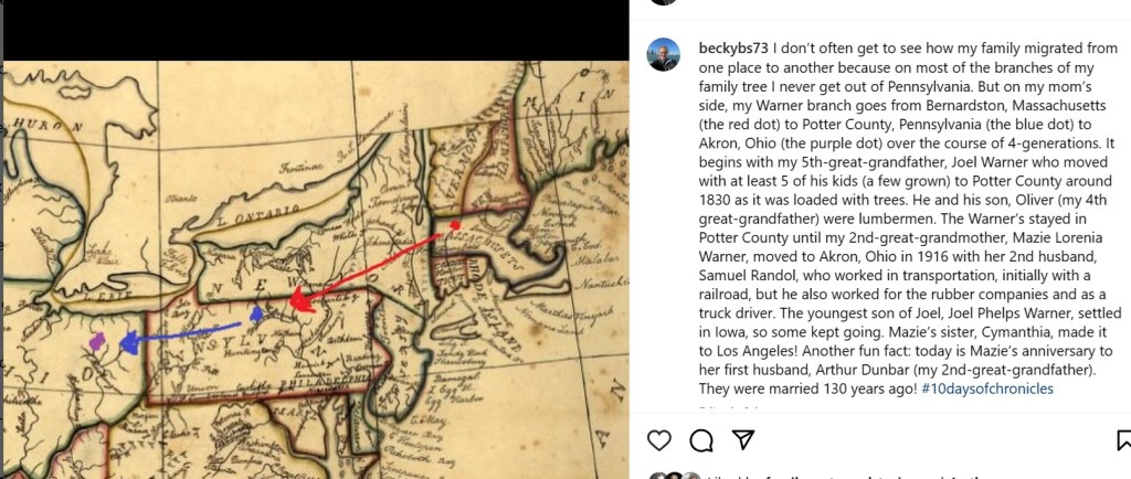 We post our chronicle to social media. The main 2 that are friendly to hashtags are Twitter/X or Instagram. Not having a whole lot on Instagram I’ve opted to use it this time, but I also have the little option to have it shared on Facebook which allows my family to view it as well – and they tend to comment. It’s working out nicely too as I’m focusing this round of questions on my mom’s side of the family, specifically my Warner family.