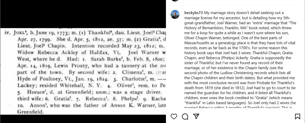 Day 3 was a marriage story – so I discussed Joel Warner and his “extra” marriage to Gratia Chapin (that never happened)