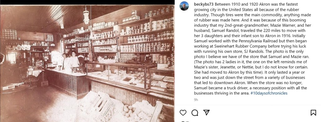 Day 4 was discussing how a historical event impacted your family so I discussed the boom of the rubber industry and why 2nd-great-grandmother, Mazie Warner, moved to Akron, OH