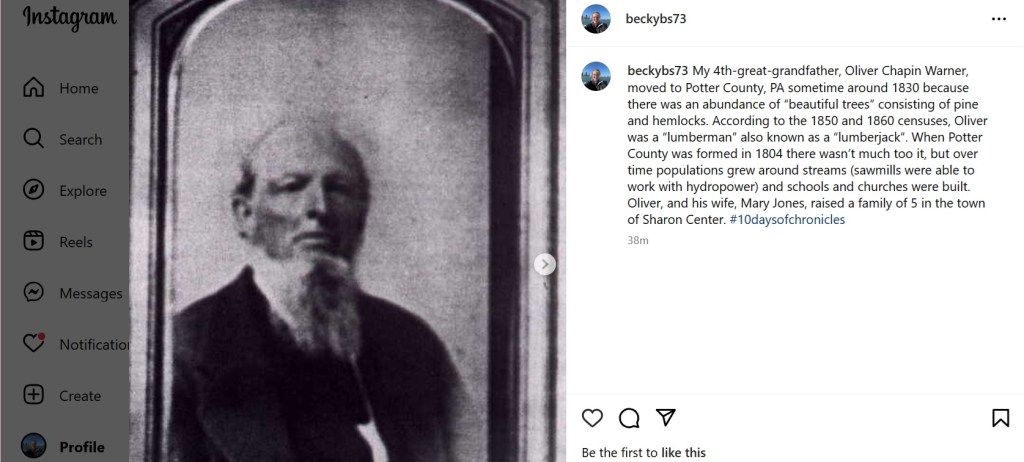 Day 5 discussed a specific occupation of our ancestor so I discussed how Oliver Chapin Warner, my 4th-great-grandfather was a lumberjack!