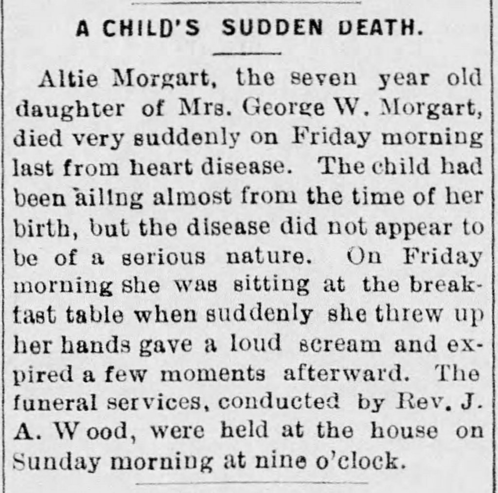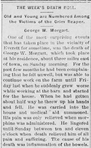 As for George, his family fell apart shortly after his death. His daughter, Altie, died 3 months after he did with heart issues, his wife committed suicide 13 years later, and his oldest son did the same 9 years after his mom. Just sad. I don’t think my great-great-grandmother ever got over the loss of her first husband (she re-married Bartley Hughes who owned the farm next door a few years after George passed away) and daughter. I have yet to find anything to figure out why my great-grandfather, Charles Jackson Morgart hanged himself.