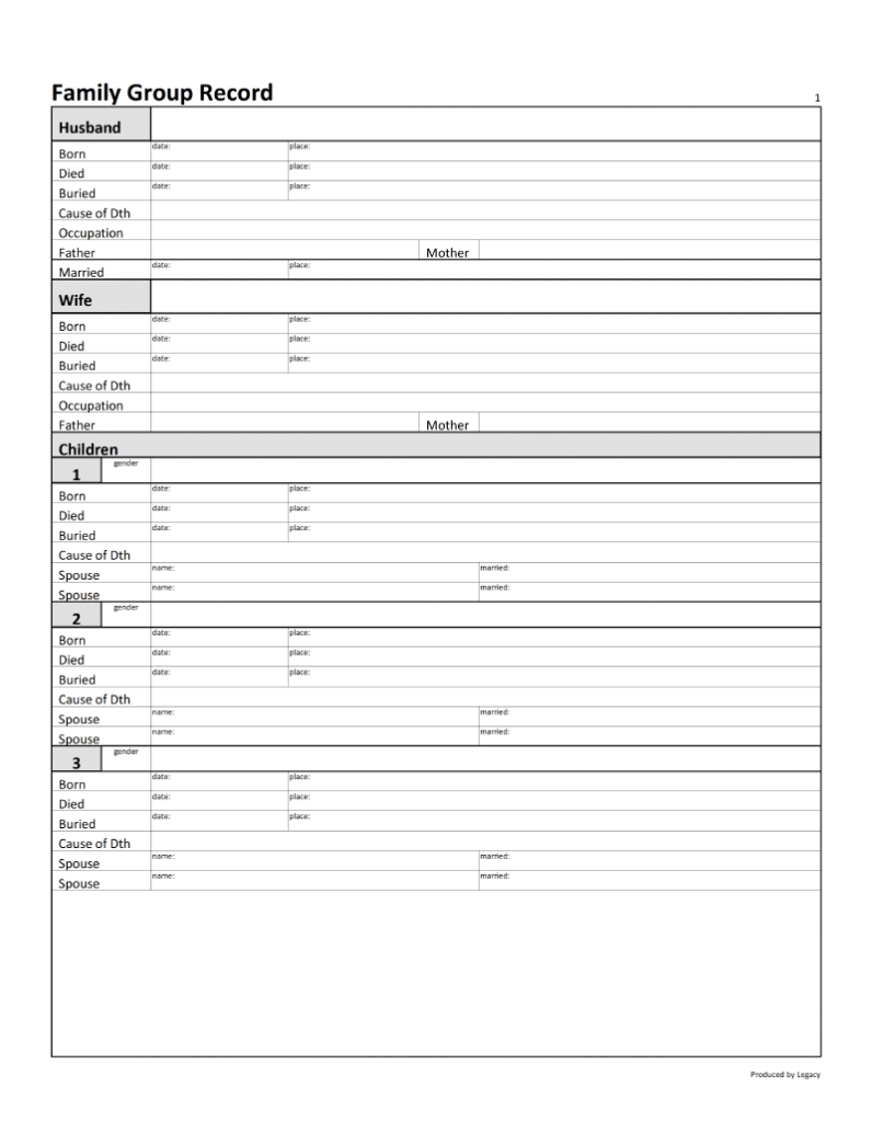 Once you have the basic information about your family members it’s best to fill out a family group chart. These can be found online for free. It is just a worksheet that you use to give all the details you have about your family. If there is a record you are missing, you will clearly see what it is and be able to research the information you need. Below is a sample page 1 of the Family Group Chart that comes with the Legacy Family Tree software.