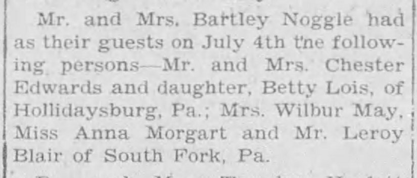 Their first child, a son, Darrell, was born 22 September 1906 and died on 22 January 1907 of bronchial pneumonia. Next came a daughter, Vada, who was born on 2 December 1907. Vada lived to be 87 years young, which is surprising as she was born with a cleft pallet and wasn’t really expected to survive. Genevieve came on 14 May 1909 (though it may have been 1910, I’ve not been able to find a birth certificate online or in the list of birth certificates on the website for the Pennsylvania Historic and Museum Commission). My grandfather, originally named Charley Wilmer Blair, later renamed Leroy, was born on 13 February 1912. Finally, Donald, the baby, was born 23 September 1917.