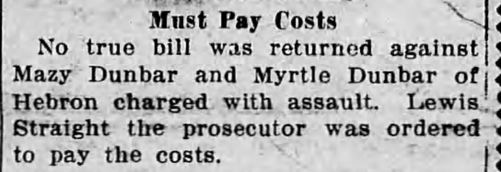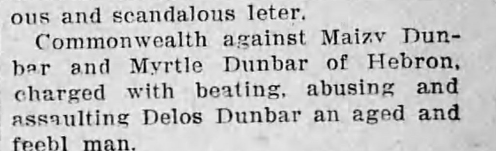 After posting my story about my great-great-grandmother, Mazie Lorena Warner, I discovered an interesting article about her. Oddly enough, she and my Aunt Myrtle were both charged with assault on my great-great-great-grandfather, Delos Dunbar (Mazie’s father-in-law).