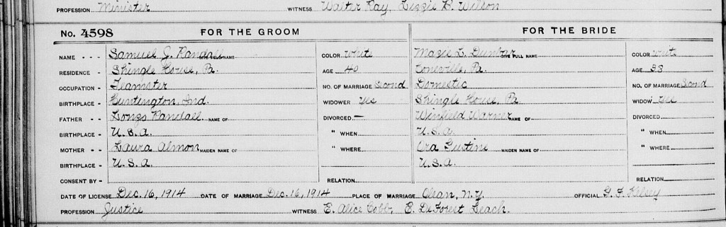 Portion of the page from the New York Marriage License of Samuel Randol & Mazie (Warner) Dunbar – this Record of Marriage was found on FamilySearch