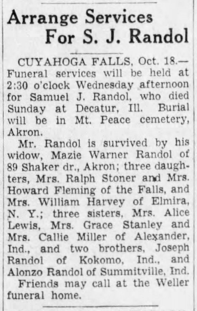Around 1923 he opened his own grocery store entitled “SJ Randols” located on Howard Street in North Akron. This entrepreneurial endeavor did not last long as he was once again a truck driver by 1925 (I tracked his occupations once he arrived in Akron using the digitized City Directories that are located online by the Akron-Summit County Public Library, from years 1859-1969).