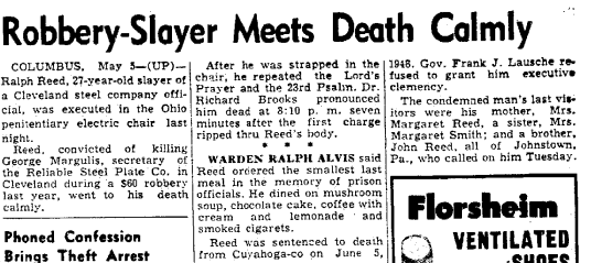 Despite at least 2 stays of execution by the governor, Ralph Reed was executed on 4 May 1949 at 8pm. He was pronounced dead by 8:10pm. He had one of the least exciting final meals in the memory of the Ohio State Penitentiary warden: mushroom soup, chocolate cake, coffee with cream, and lemonade and he smoked cigarettes. His final visitors were his mother, Margaret (Phillips) Reed, his sister, Margaret (Reed) Smith, and his brother, John Reed. I’ll let the newspaper article describe the details of his electrocution in “Old Sparky” as journalism is just not this descriptive anymore.