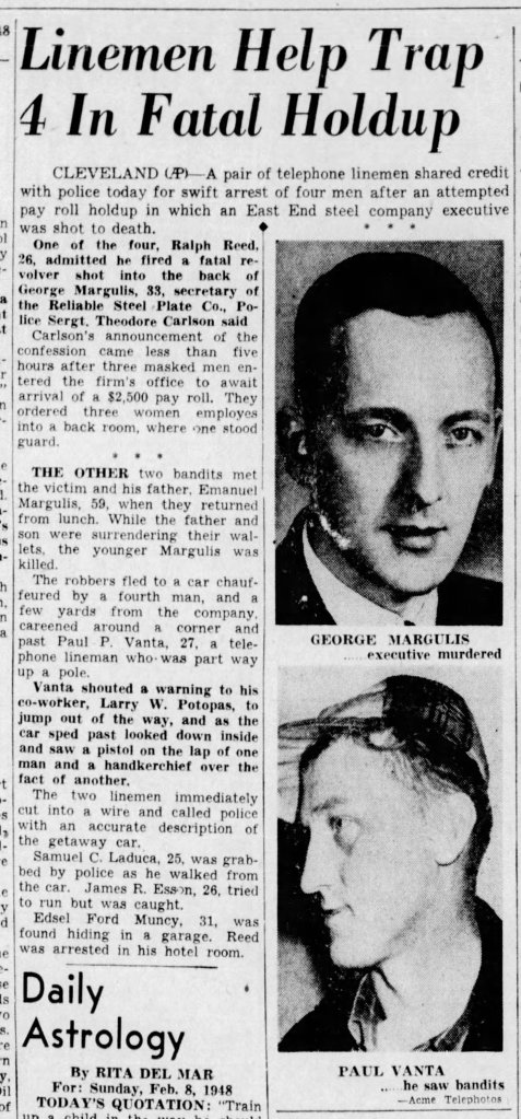 Ralph Reed, along with 3 others: Samuel LaDuca, James Esson, and Edsel Ford Muncy decided to rob the payroll office of the Reliable Steel Plate Company in Cleveland, Ohio on Friday, February 6, 1948. One has to remember that in 1948 payroll was paid with cash, but the 4-men made a fatal error, they arrived before the money did.