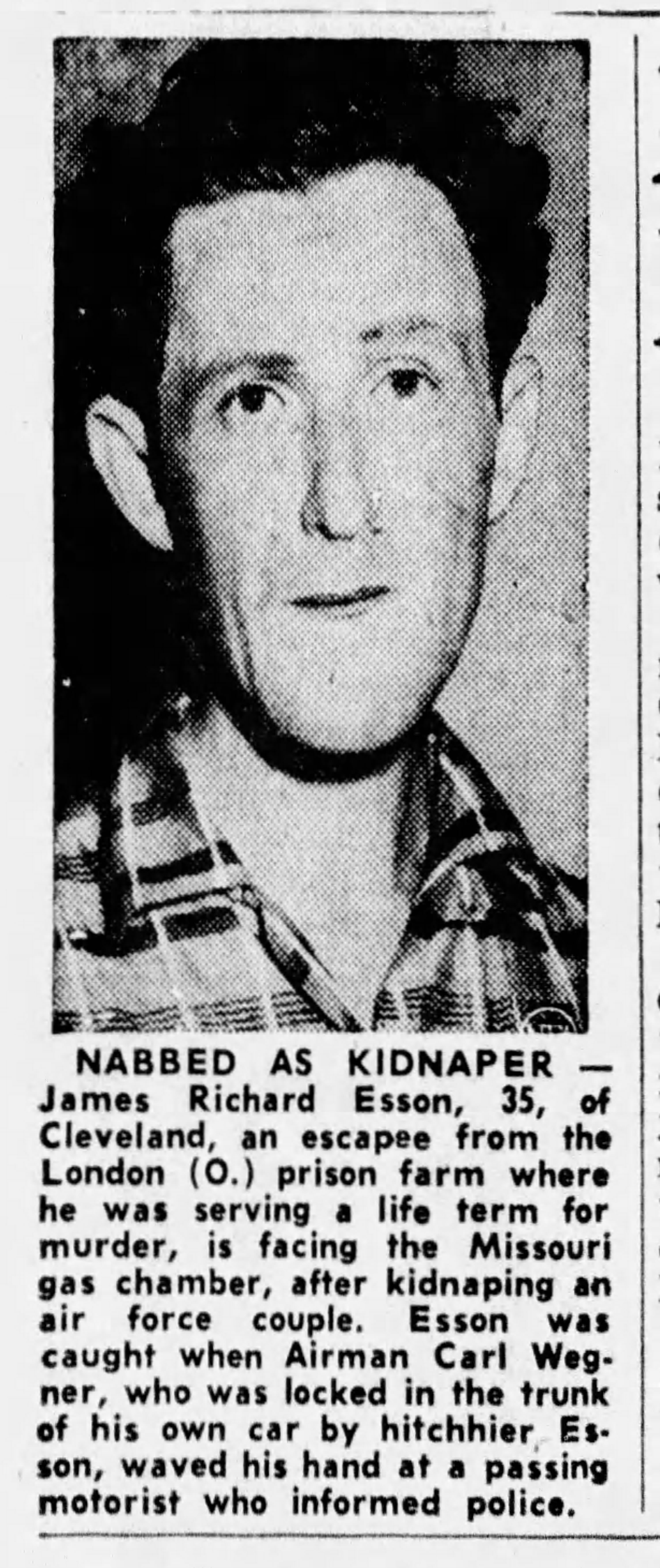 Esson stayed on the run until he was caught in Kansas City, Missouri when he was hitch hiking and offered a ride by a couple, Mr. & Mrs. Carl Wegner (Wagner?), who were on their way to an Air Force base in Kansas. He ended up locking them up in their trunk and was reported by a passing motorist. (The below photos were taken from The Tribune (Coshocton) on 19 August 1957).